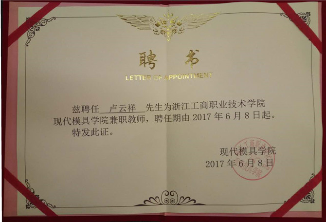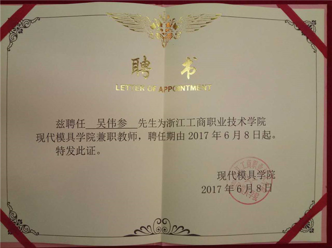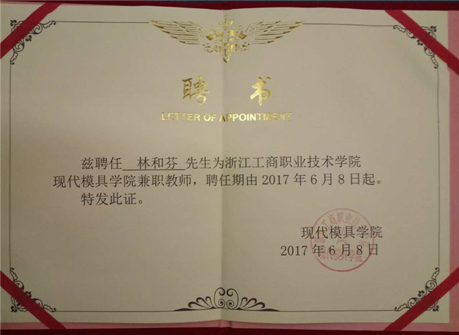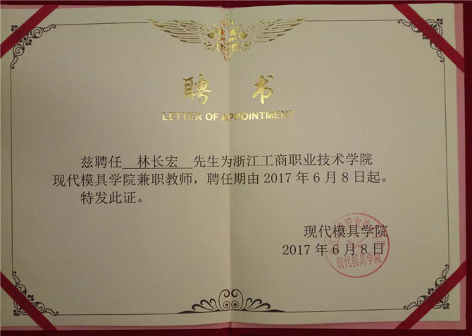 自2010年华宝公司与浙江工商职业技术学院校企合作以来,华宝模具事业部涌现出一大批具备兼职教师资格的资深骨干,他们被工商学院聘任为兼职教师。2017年6月8日,华宝股份又有四位同志被浙江工商职业技术学院宁海分院聘为现代模具兼职教师,他们分别是林和芬、卢云祥、林长宏、吴伟参。