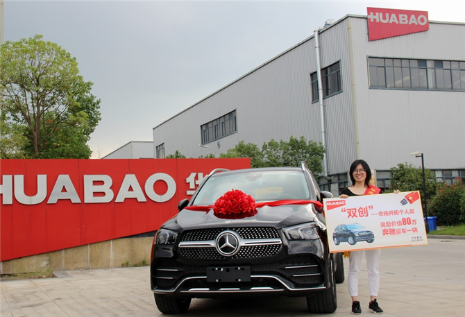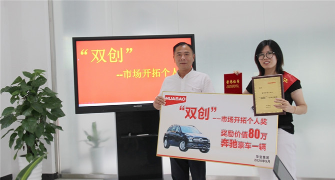 2020年9月29日,“双创”--市场开拓个人奖授车仪式在华宝集团隆重举行。分管外贸的俞玲玲女士以突出的销售业绩获此殊荣,奖励价值80万的奔驰豪车一辆。
